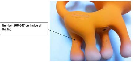 此次被召回的產品名稱為Go Gaga Squeeze & Teethe Coco the Monkey,是一款擠壓發聲的嬰兒玩具。玩具材質為橙色軟橡膠,外形如猴狀,具高4.5英寸,長5英寸,可供新生兒及以上嬰兒玩耍。“Infantino”標識于玩具后背面,型號206-647則標識于左后腿內側。該產品于2012年12月-2014年1月在美國Target商店及相關網站上銷售,售價約為13美元/個。