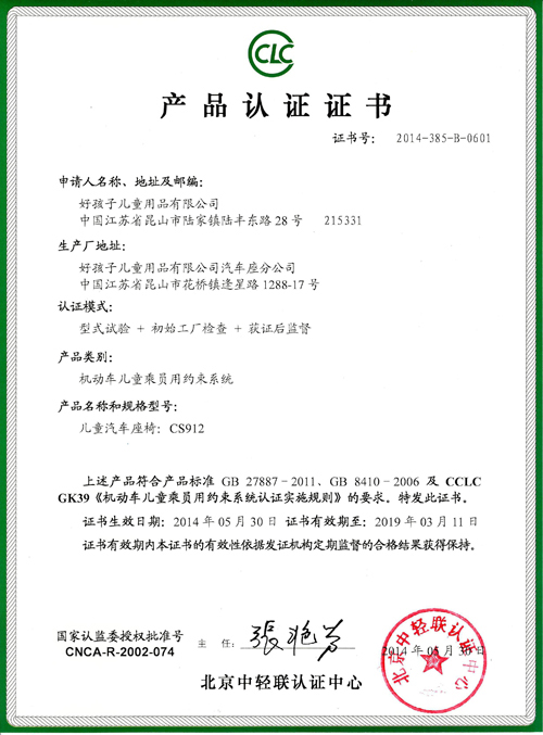 好孩子兒童用品有限公司于2014年六一兒童節(jié)前獲得我中心首張兒童汽車座椅證書。